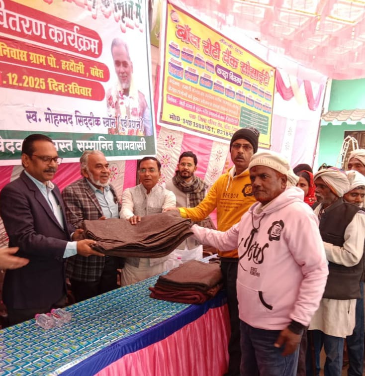 बांदा। प्रत्येक रविवार की तरह आज भी बाँदा रोटी बैंक सोसाइटी के संरक्षक शेख़ सादी जमा और बांदा रोटी बैंक सोसाइटी के सहसंरक्षक चन्द्रमौली भारद्वाज के संरक्षण में बाँदा रोटी बैंक सोसाइटी के अध्यक्ष रिज़वान अली की अध्यक्षता में बाँदा रोटी बैंक सोसाइटी के संगठन मंत्री सुनील सक्सेना के नेतृत्व में,पूर्व ग्राम प्रधान ग्राम हरदौली मोहम्मद शादाब जी की उपस्थिति में,समाजसेवी ग्राम हरदौली सैफुल्लाह 200 कम्बल के विशेष सहयोग से बाँदा शहर के जिम्मेदार जागरूक लोगों के द्वारा दान में दिए गए कम्बल, कपड़े,जूते चप्पल आदि का वितरण ग्राम हरदौली ब्लॉक बबेरू तहसील बबेरू जनपद बाँदा के जरूरतमंद ग्रामीणों को किया गया तथा साथ ही ग्रामीणों को सर्पदंश, स्वास्थ्य,स्वच्छता तथा उनके कानूनी अधिकारों के प्रति बाँदा रोटी बैंक सोसाइटी की टीम की महिला महामंत्री रिया खान और उपाध्यक्ष मोहम्मद सलीम के द्वारा जागरूक किया गया,समाजसेवी सैफ़ उल्लाह ने सभी का आभार व्यक्त किया। उक्त कम्बल,कपड़े आदि पाकर ग्रामवासियों में अपार खुशी दिखाई दी सभी लोगों को दुआओं और आशीर्वाद से नवाजा उक्त कार्यक्रम में मुख्य अतिथि के रूप में डा. अजय कुमार ए0सी0एम0ओ0 बाँदा, विशिष्ट अतिथि डा. मक़सूद नेत्र विशेषज्ञ,डा0 अनस दन्त रोग विशेषज्ञ, बाँदा रोटी बैंक से कार्यालय प्रभारी मोहम्मद शमीम,उपाध्यक्ष मोहम्मद सलीम, शाखा प्रमुख खाई पार इरफान खान चाँद, उप शाखा प्रमुख छिप्तहरी अलीमुद्दीन,सदस्य जगदीश श्रीवास,निहाल खान, शहाना खान, नग्गो खातून आदि पदाधिकारी, सदस्यों एवं समाजसेवियों ने अपना महत्वपूर्ण योगदान दिया और कार्यक्रम को सफल बनाने में सहयोग किया।